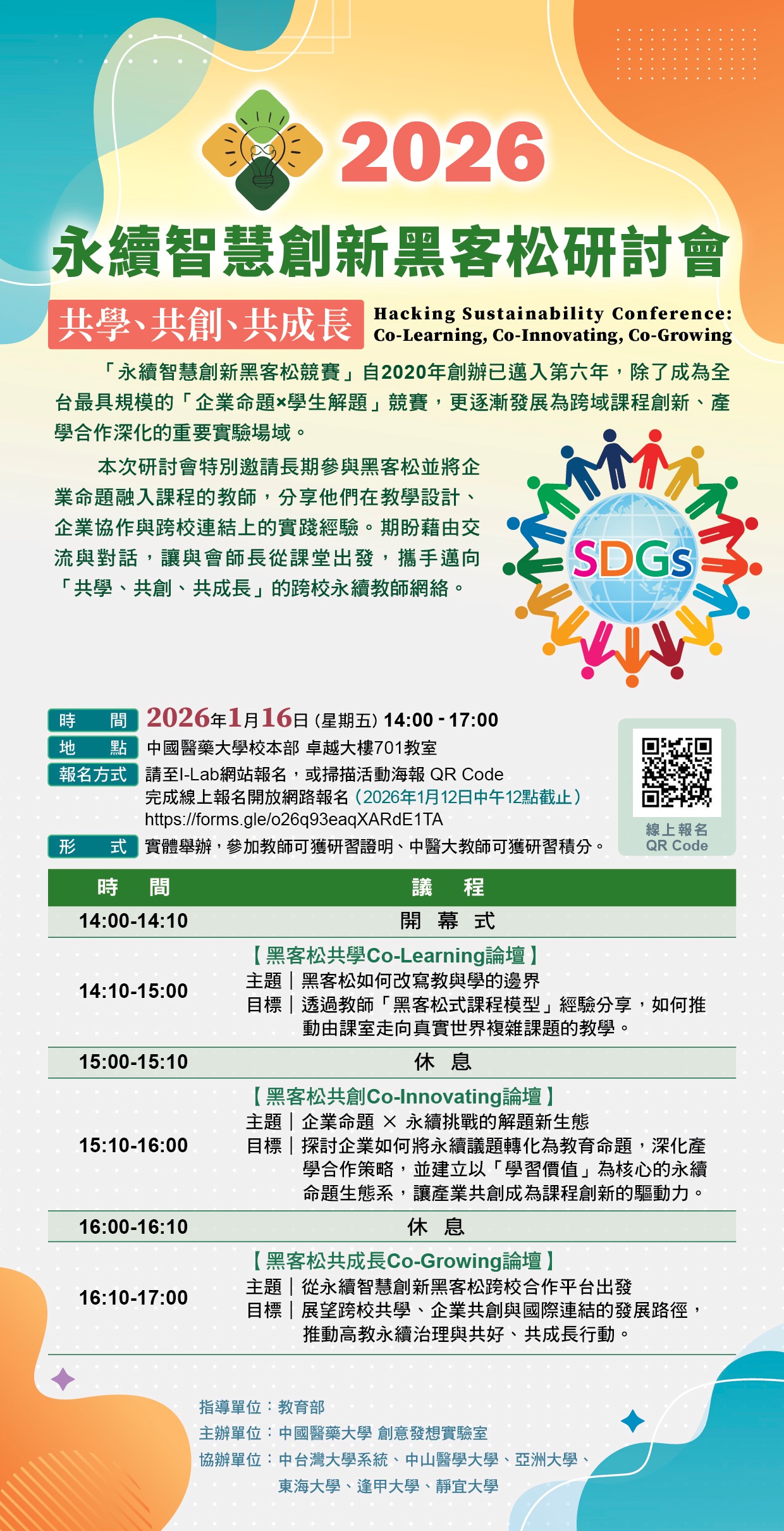 【中國醫藥大學】「2026永續智慧創新黑客松研討會:共學、共創、共成長」教師研習活動 2025-12-30 校外來文 一、「永續智慧創新黑客松競賽」自2020年創辦已邁入第六年,除了成為全台最具規模的「企業命題×學生解題」競賽,更逐漸發展為跨域課程創新、產學合作深化的重要實驗場域。本次「2026永續智慧創新黑客松研討會:共學、共創、共成長」特別邀請長期參與黑客松並將企業命題融入課程的教師,分享他們在教學設計、企業協作與跨校連結上的實踐經驗。鼓勵有興趣教師報名參加,藉由交流與對話,讓與會師長從課堂出發,攜手邁向「共學、共創、共成長」的跨校永續教師網絡。二、本研習由中醫大創意發想實驗室CMU I-Lab以實體主辦,參與教師可獲研習證明:時間:115年1月16日(五)14:00–17:00;地點:中國醫藥大學校本部(台中市北屯區經貿路一段100號)卓越大樓 701 教室。三、報名至115年1月12日中午12點截止,議程活動資訊網頁:https://ilab.cmu.edu.tw/news/269 簡章 海報 You Might Also Like 【農業部】115年青年回鄉行動獎勵計畫 2025-08-28 【亞東科技大學】2025創客競賽-第五屆創新設計生活家競賽 2025-08-25 【巨思文化股份有限公司】2025 青春靚點子 全國學生創業挑戰賽 2025-09-08