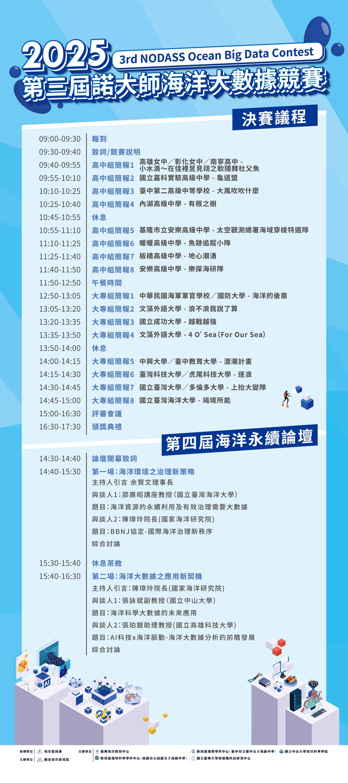 【國家海洋研究院】「2025第三屆諾大師海洋大數據競賽」決賽現場觀賽及線上直播 2025-12-10 校外來文 一、國家海洋研究院原訂於11月12日辦理「2025第三屆諾大師海洋大數據競賽」決賽學生報告,並開放現場觀賽及線上直播。惟因鳳凰颱風影響,活動順延至12月18日舉行。二、本活動旨在透過競賽讓參賽者展現運用大數據探討海洋議題的創新方案,並鼓勵大專院校及高中職生將科學研究應用於海洋永續發展,各組隊伍從初賽、工作坊、複賽,最終進入決賽,相關活動資訊如下:(一)決賽及評審時間:12月18日(四)9時至16時30分。(二)頒獎時間:12月18日(三)16時30分至17時30分。(三)地點:高雄軟體園區B1國際會議廳(高雄市前鎮區復興四路12號)。三、本次決賽將開放現場觀看學生報告,有意參加的朋友,請務必填寫以下表單,以便我們安排座位及提供競賽最新資訊 。https://forms.gle/enpZQHY36m7aPksDA四、當日亦提供 YouTube 線上直播,請於Youtube平台搜尋「國家海洋研究院」觀看直播。五、活動詳情請參閱「諾大師海洋大數據競賽」活動網站https://sites.google.com/view/nodassbigdata/index 決賽議程 You Might Also Like 【台灣發明協會】2026第51屆瑞士日內瓦國際發明展 2025-09-25 【國家海洋研究院】2025第三屆諾大師海洋大數據競賽決賽直播 2025-11-04 【國立高雄餐旅大學】企業座談暨專家會議:餐飲AI新趨勢X智慧人才培育新藍圖 2025-12-09