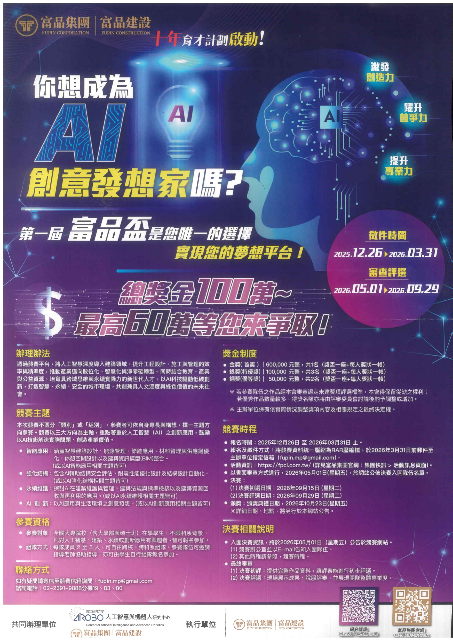 【富品集團│富品建設】第一屆富品盃AI創新應用競賽 2025-12-30 校外來文 You Might Also Like 【台灣發明商品促進協會】2026第18屆歐洲盃國際創新發明展 2025-09-09 【朝陽科技大學】2025園區產業與 學研鏈結合作及交流媒合會-南港軟體園區場 2025-08-19 【FITI 計畫辦公室】2025 Meet Taipei × FITI「Young Sparks」 2025-09-10